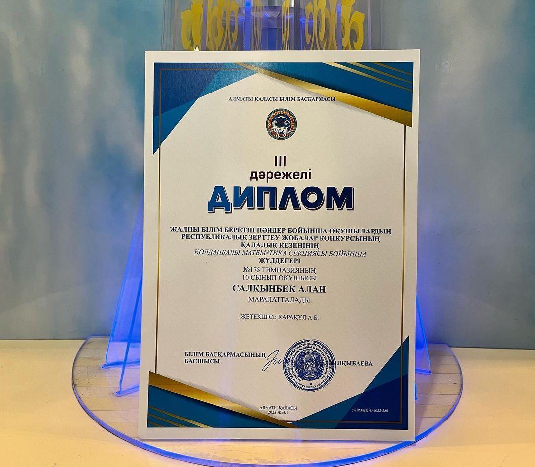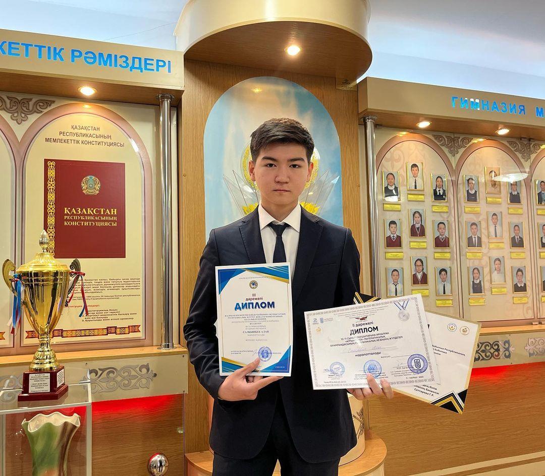 Гимназиямыздың 10-сынып оқушысы Салқынбек Алан. Математика пәні бойынша аудандық, қалалық олимпиадаларлың жеңімпазы. 9-11 сынып оқушылары арасындағы республикалық пәндік олимпиаданың қалалық кезеңінің жеңімпазы. Жетекшісі – Қарақұл Абзал.