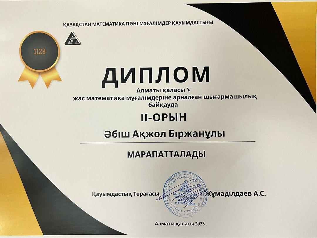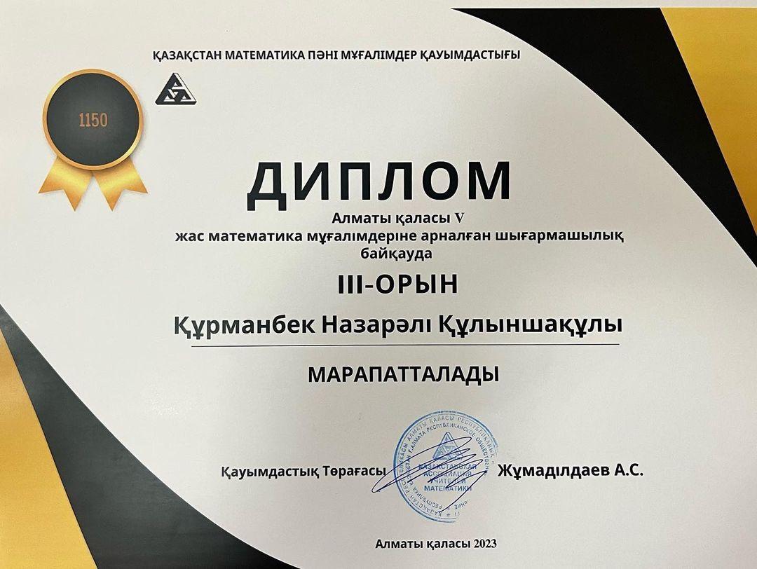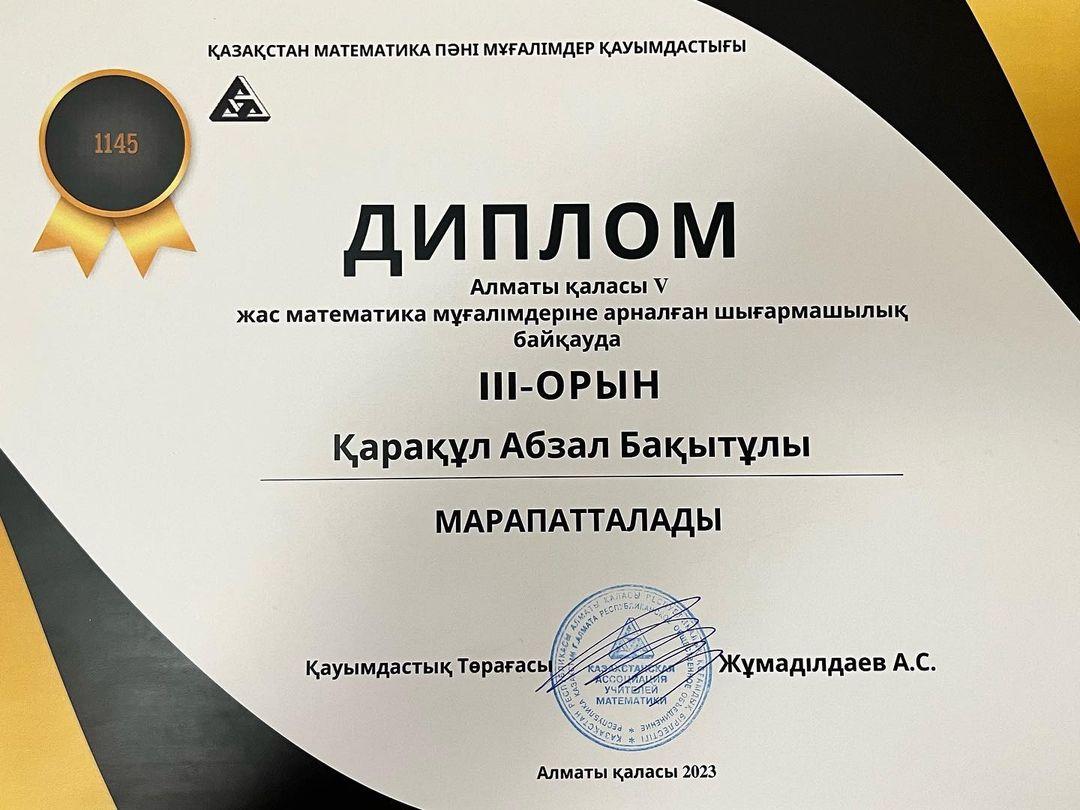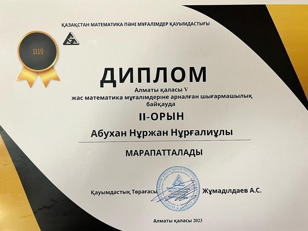 Қазақстан математика пәні мұғалімдері қауымдастығының ұйымдастыруымен өткен V Алматы қаласының жас математика пәні мұғалімдерінің арасында өткен олимпиадада гимназиямыздың математика пәні мұғалімдері Әбіш Ақжол (2-орын), Абухан Нұржан (2-орын), Қарақұл Абал (3-орын), Құрбанбек Назарәлі (3-орын) жүлделі орындарға ие болды.