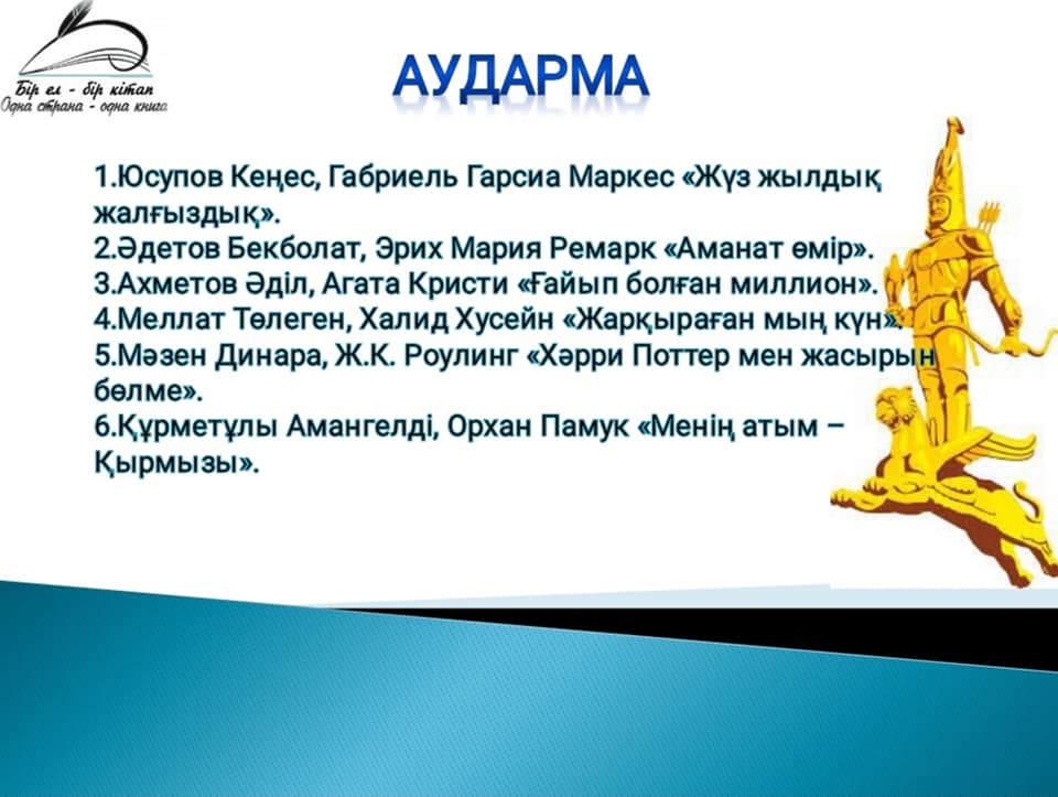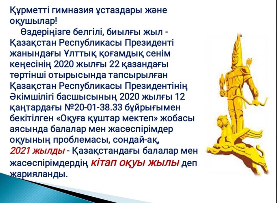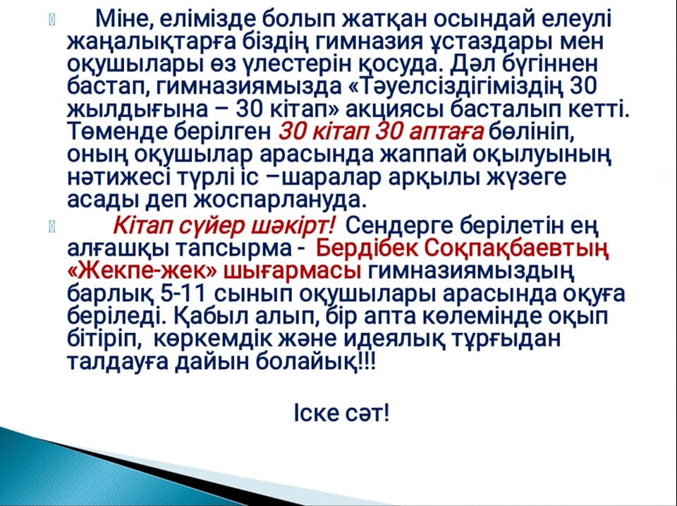 Құрметті, кітап сүйер шәкірт!!! "Тәуелсіздігіміздің 30 жылдығына - 30 кітап" рухани -мәдени акциясына белсенді түрде қатысуға шақырамыз. Бүгіннен бастап апта сайын бір кітап оқуға беріледі. Оқыған кітапты талдау мақсатында мектеп көлемінде дөңгелек үстел, оқырмандар конференциясы өтеді. Жауапты: қазақ тілі мен әдебиеті пәнінің мұғалімдері