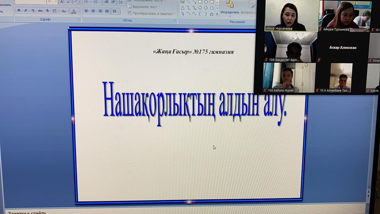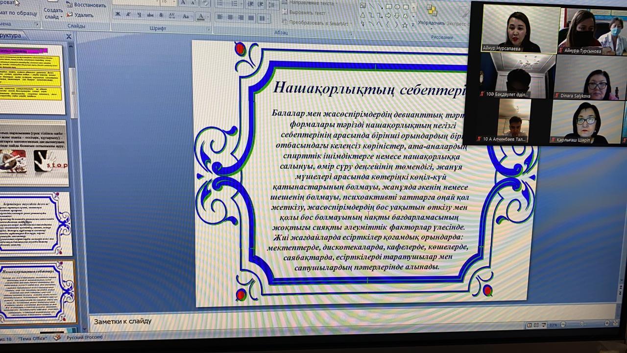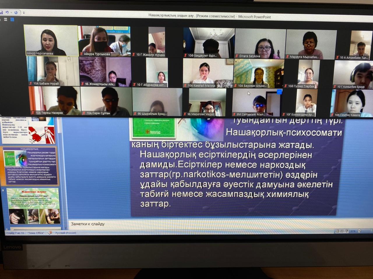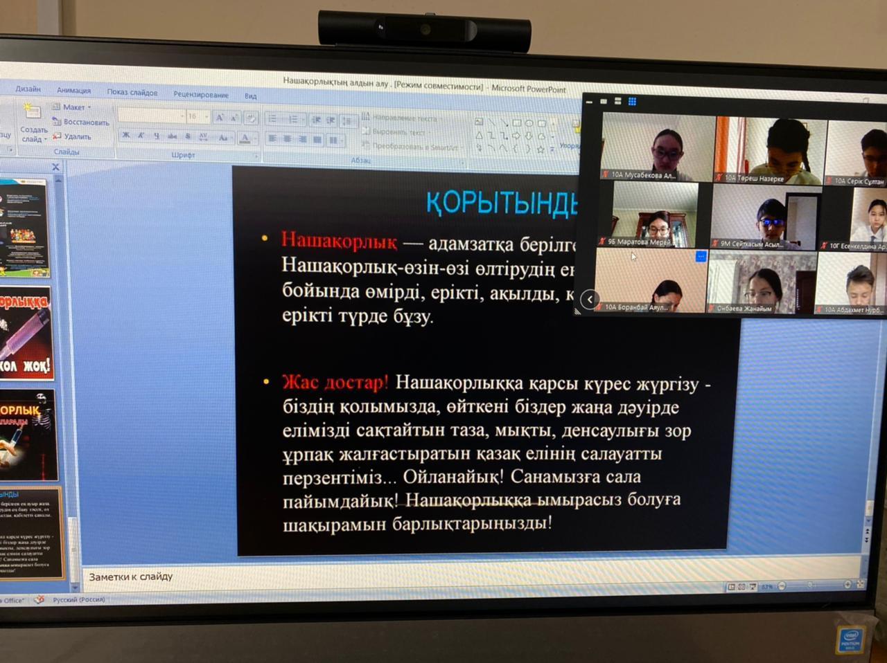 “Нашақорлықтың алдын алу” тақырыбында 9-10 сынып оқушыларымен дәріс сабағы өтті. Директордың тәрбие ісі-жөніндегі орынбасары гимназия оқушыларын жаман әдеттерден аулақ болуға, өзге адамдардың арбауына көніп қалмауға шақырды. Сонымен қатар, гимназия психологы есірткі, марихуана, насыбайдың денсаулыққа өте зиян екендігін оқушыларға түсіндіріп өтті. Гимназия мебдикесі оқушыларға есірткінің қоғамда пайда болып жатқан жаңа түрлерін, одан аулақ болуға, сондай-ақ есірткі пайдаланатын адамды қалай анықтауға болатыны туралы ақпарат берді. Салауатты өмір салтын ұстануға кеңес берілді.