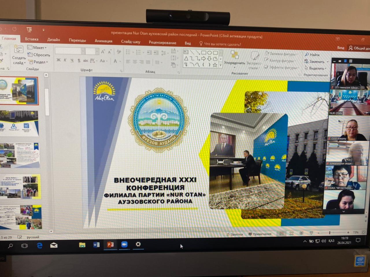 27 сәуір күні “Нұр Отан” партиясының Әуезов аудандық филиалында кезектен тыс 31-ші конференциясы болып өтті. Конференция барысында 2019-2020 жылдың саяси кеңес бюросының есебі талқыланды және саяси кеңес бюросының жаңа мүшелері ұсынылды.