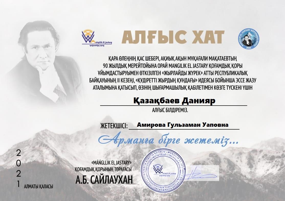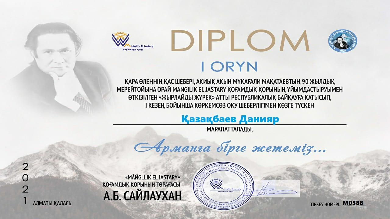 Қара өлеңнің қас шебері, ақиық ақын Мұқағали Мақатаевтың 90 жылдық мерейтойына орай El jastary қоғамдық қорының ұйымдастыруымен өткізілген “жырлайды жүрек” атты Республикалық байқауға қатысып, көркемсөз оқу шеберлігімен көзге түскен Қазақбаев Данияр марапатталды. Құттықтаймыз.