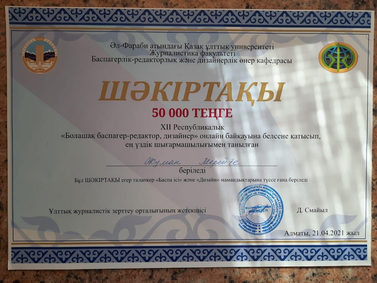 21 май 2021 0 1 2 3 4 5 БІЛІМДІЛЕР АЙНАСЫ XII Республикалық “Болашақ баспагер- редактор, дизайнер” онлайн байқауына белсене қатысып, ең үздік шығармашылық өнерімен танылған Жұман Мерейді жеңісімен құттықтаймыз. Осы беттің QR-коды:QR-код этой страницы: