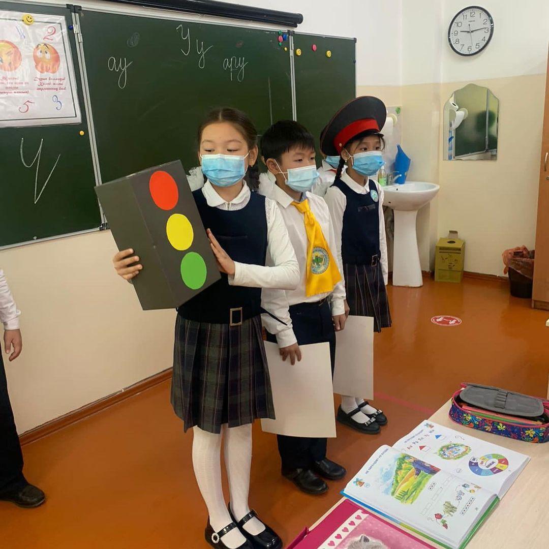 Бастауыш сынып мұғалімдері Насурллаева Қ.А мен Жарылқасынова А.О ұйымдастыруымен сыныптан тыс іс шара ұйымдастырылды. 4 сынып оқушылары 1-сынып оқушыларын жолда жүру ережесімен таныстырды. Мақсаты: жолда жүру ережесін есте сақтау, жол белгілерінің түрлерімен таныстыру, бағдаршам туралы толық білу, жол белгілерінің атқаратын қызметі қандай екенін үйрету Бағдаршамның түстерін үш тілде айтып, 1 сынып оқушыларының сұрақтарына жауап беріп , өздерінен кіші буынға үлгі бола білді.